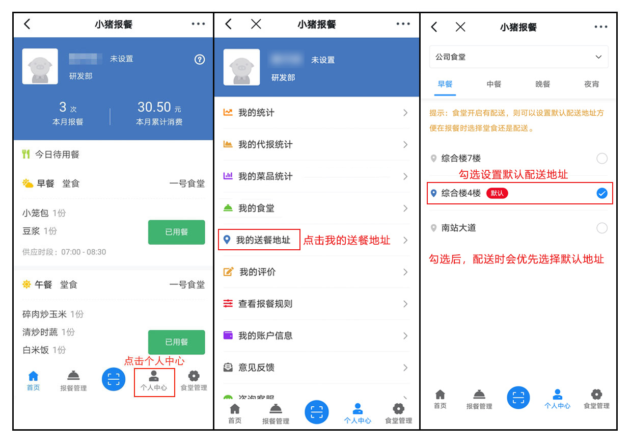 目录 搜索 一、新手向导1、小猪报餐是什么2、如何安装应用二、pc端操作手册1、添加食堂2、食堂设置3、添加菜品4、添加采购5、批量报餐6、储值管理7、用餐方式8、查看核销9、查看评论10、数据统计11、组织管理12、菜品排行13、分配权限14、设置应用的可使用范围三、移动端操作手册普通用户操作1、报餐与代报2、扫码用餐3、发表评论4、个人中心5、设置默认食堂6、开启/关闭报餐提醒管理员操作1、添加食堂2、添加菜品3、添加采购4、编辑食堂5、扫码核销6、查看核销记录7、查看未报餐人员8、查看数据四、付费功能介绍1、小猪报餐付费政策2、发票说明 暂无相关搜索结果! 本文档使用 MinDoc 发布 5、设置默认食堂 设置默认食堂 设置默认配送地址文档更新时间: 2022-05-27 11:51 作者:滕丹妮